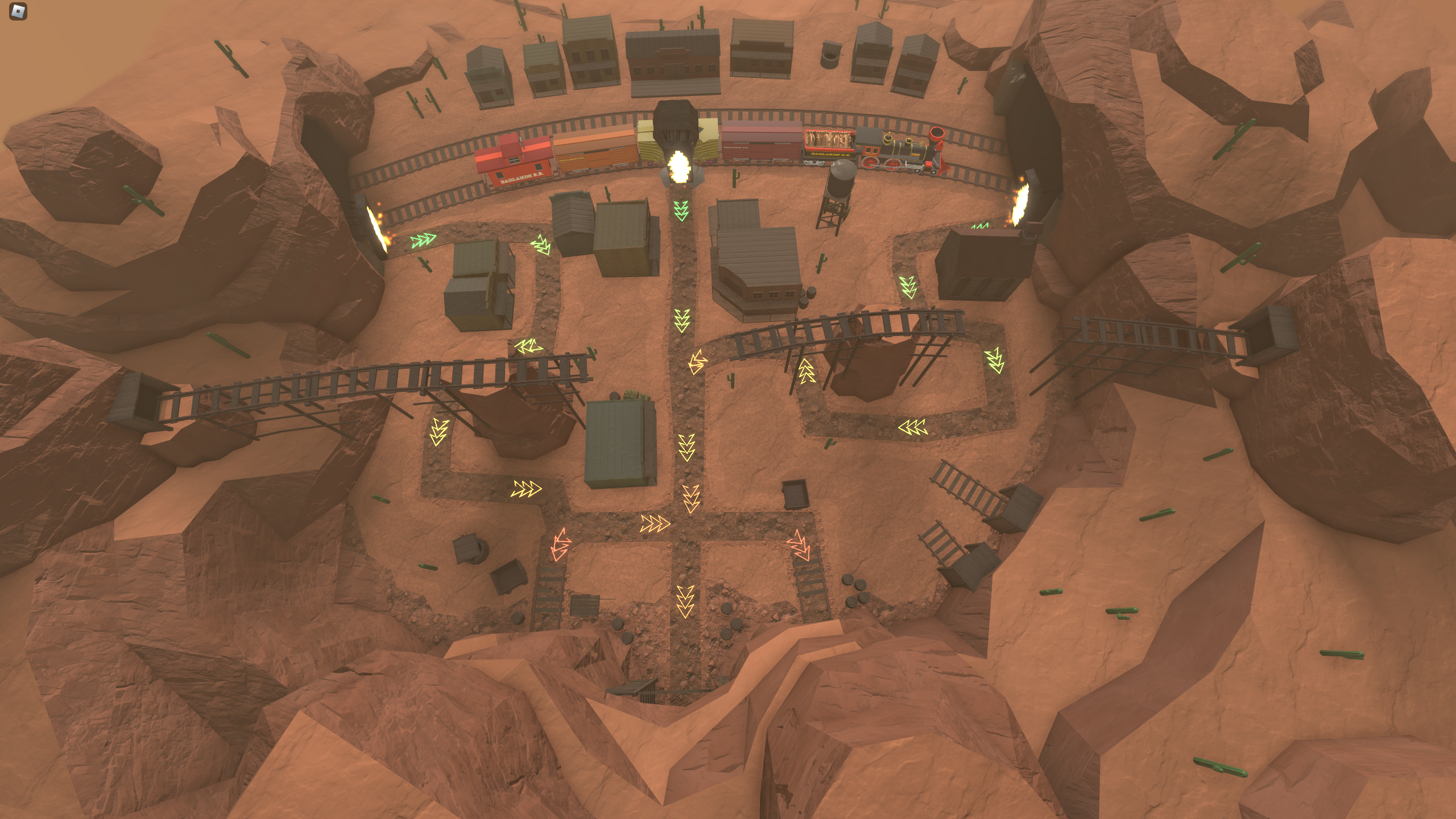 The map takes place in a Western-themed town. The terrain of this island is mainly sand, with plenty of western-themed buildings, on which you can place cliff towers. Two rail tracks can be found on the ground, with a train on one of them. Multiple entrances to cave mines can be found, with minecart rail tracks leading to them. There is also a destroyed rail track above the city.