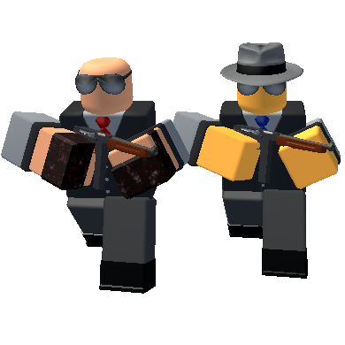 The body guard to the right of the direction of movement had tan skin. It had grey legs, a buttoned tuxedo with short sleeves that have dark grey outlines and black shoes. It also wore a blue necktie, black shades, black cotton gloves and a grey fedora with a black band. It was faceless. The body guard wielded an M1A1 Thompson.