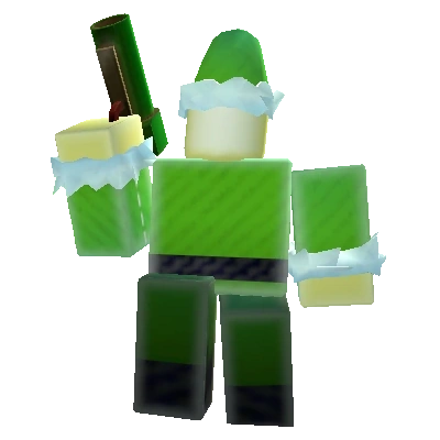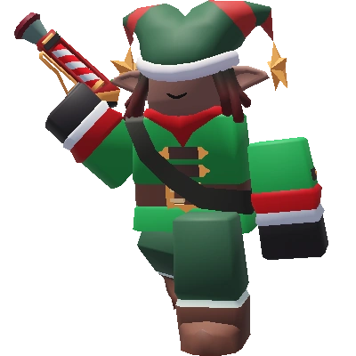 The Cannoneer Elf has dark skin and brown hair. It wears a green shirt with a brown belt and red details, green and red hat with golden stars, dark green pants and brown shoes. It wields a snowball cannon that it attacks enemies with.
