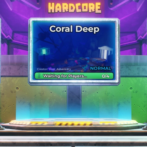 Elevators can be found inside the game's lobby. These will display the current the map it leads to, alongside the map name, creator and difficulty. At the bottom of the image, there is a progress bar, which at first displays the "Waiting for Players..." message. This changes to a timer when players have entered the elevator. At the right of the progress bar, the current number of players in the elevator is shown.