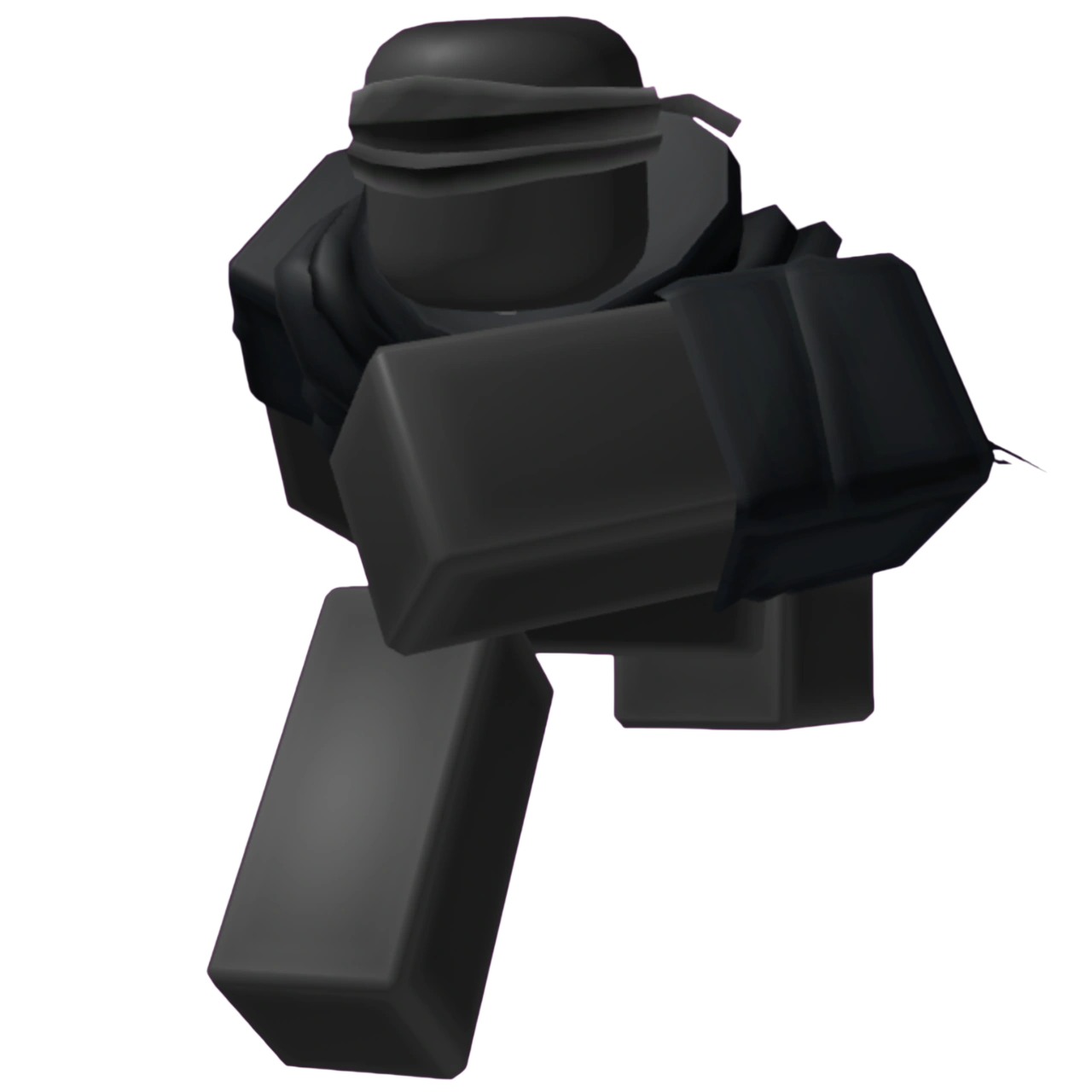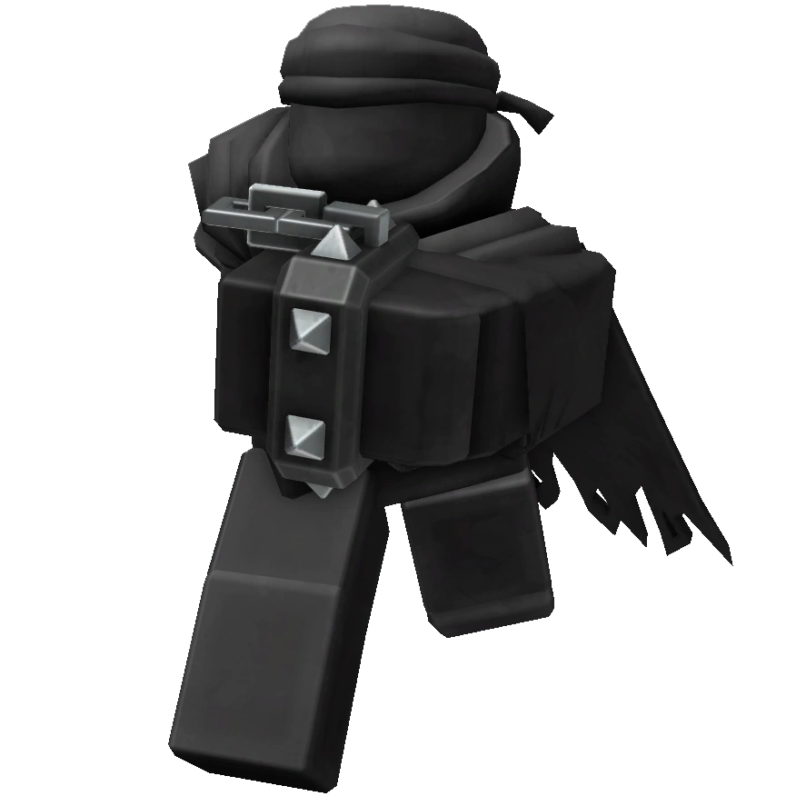 The current Enemies Beta version of the legacy Hidden Boss is a large humanoid with a waist in its rig. It has a translucent black body and wears a black cape, cloak and sleeves along with a grey blindfold.