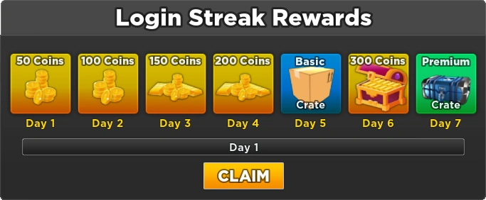 Login Rewards are gifts that are obtained by playing the game on a daily basis. The rewards get better with each day, with the streak being reset if they are not claimed in the amount of time required. Streaks are reset upon reaching the last reward back to the first day.