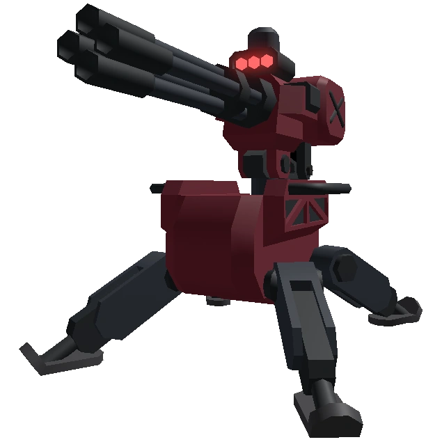 The Minigun Sentry is a quadpod device constructed out of metal, colored black and white. It is a sentry that uses a mounted minigun to attack enemies, which spins when attacking enemies. It has a red laser mounted on top. It also has a red shield, which dissapears when the Engineer that spawned the Minigun Sentry is stunned.