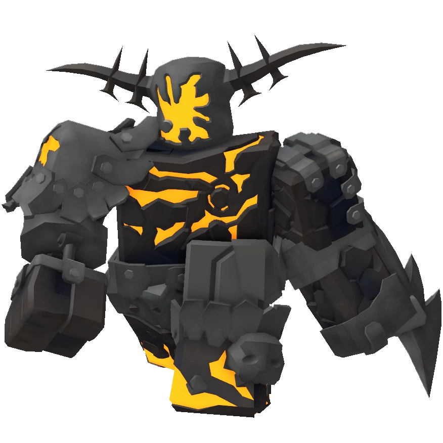 The Molten Titan has a neon orange body, covered with black molten rock, with only a few cracks revealing its body. It wears multiple pieces of armor constructed out of metal, including pants, a glove on its left arm, an arm-band with a blade attached to it, multiple pieces of metal around its left shoulder and a helmet with two black horns with thorns coming out of them. Its right arm is replaced with a mechanical arm, which has a large pauldron and its hand is connected to it with two rods.