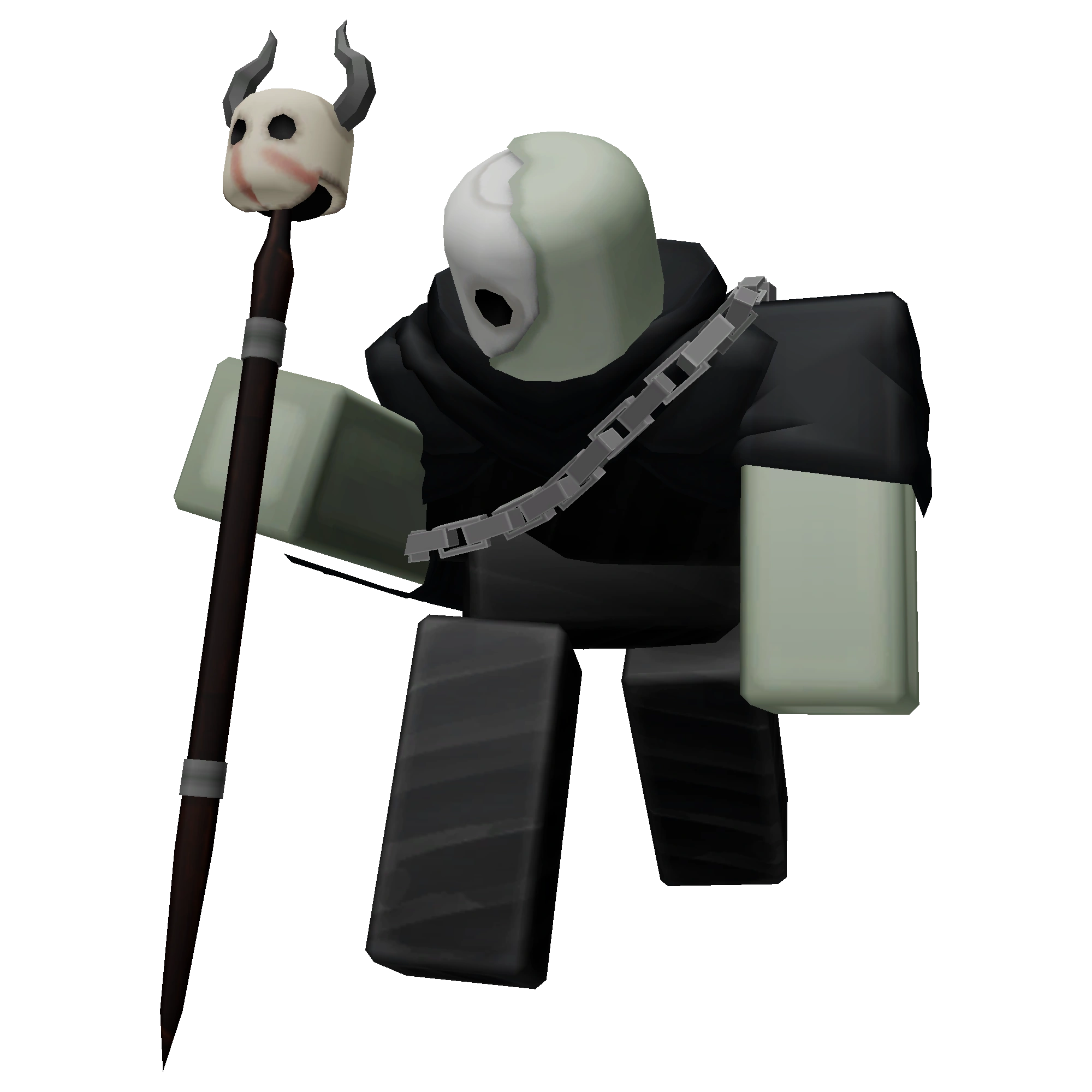 The Necromancer is a humanoid with a waist in its rig. It has a very desaturated light green skin color, and some of the skin on its head is missing, exposing a light grey skull. It has a black torso, sleeves, legs and cape. It has a light grey chain wrapped around its torso. It wields a dark brown wooden staff that has a small skull with light red streaks as well as grey horns on top of it, which it uses to summon Skeletons.