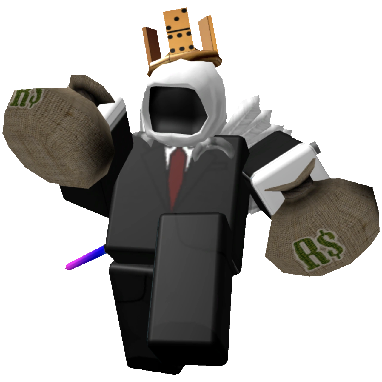 The Trader had white skin. It wore a black suit with a red tie. On its back, it carried a Fake Rainbow Periastron. On its head, it wore a Fake Dominus Empyerus and a Fake Domino Crown. It held two fake cash bags in its hands.