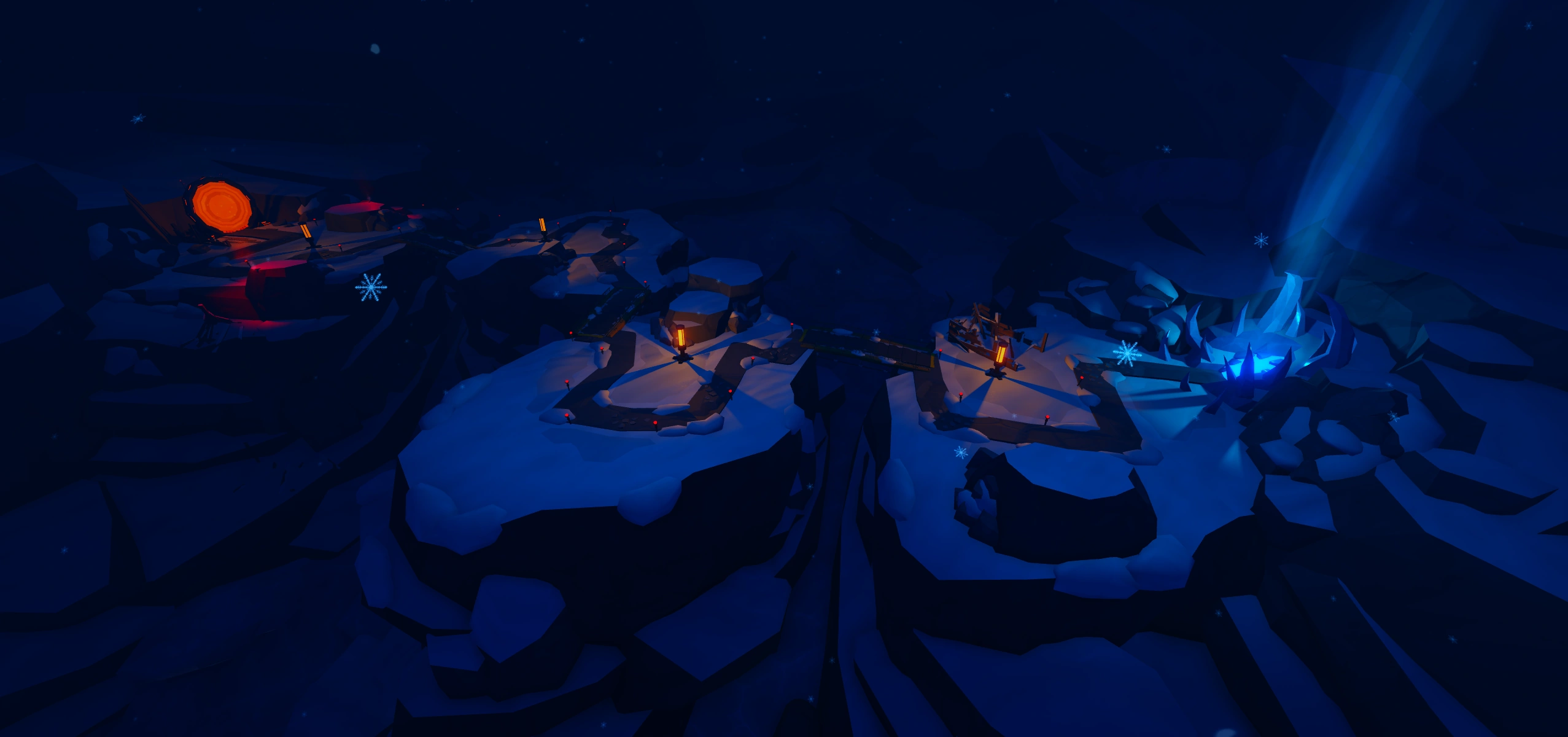 The grey stone path begins and ends at two portals. The path crosses the four islands on wooden bridges. It takes long turns around snow mounds in the middle of the map.